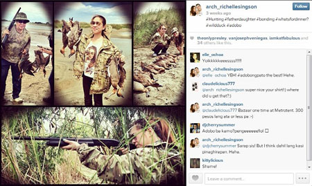 FATHER–DAUGHTER HUNTING. Bago pa man ang pamamaril niya ng leon at antelope sa Africa, binatikos na si Singson nang mag-post naman ang anak nitong si Richelle Singson ng larawan nilang mag-ama kasama ang kanilang mga nahuling wild ducks.
