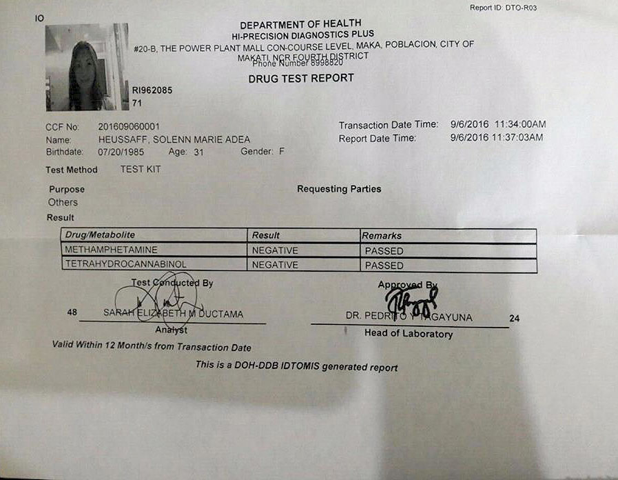 “Leo Dominguez, the talent manager of the Filipina-French actress/model, has decided to publicize her results in support of the Government's stand and campaign against illegal use of prohibited drugs.